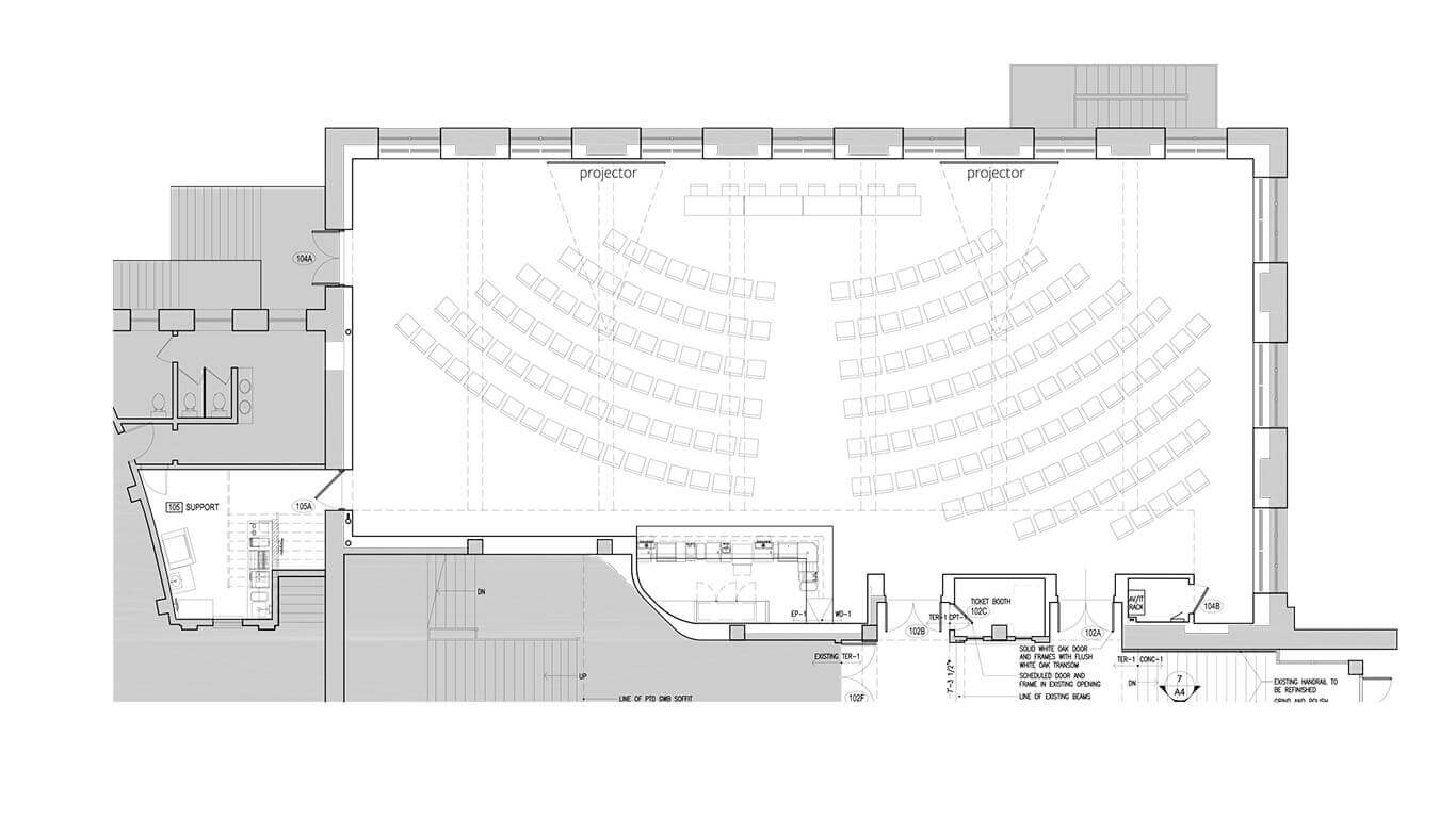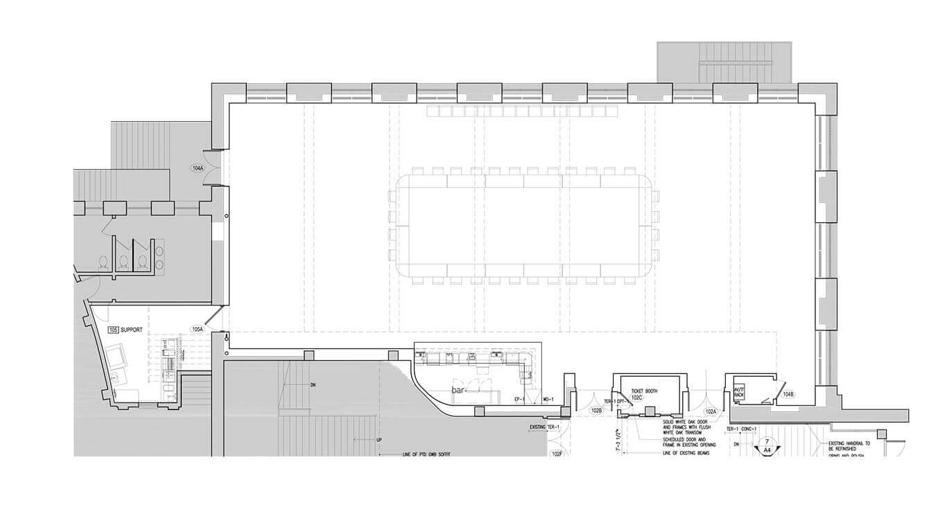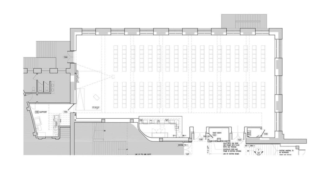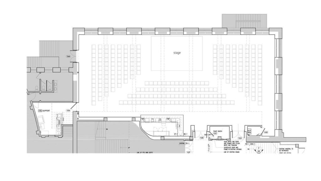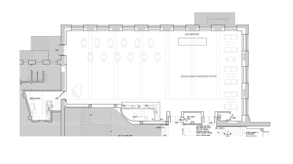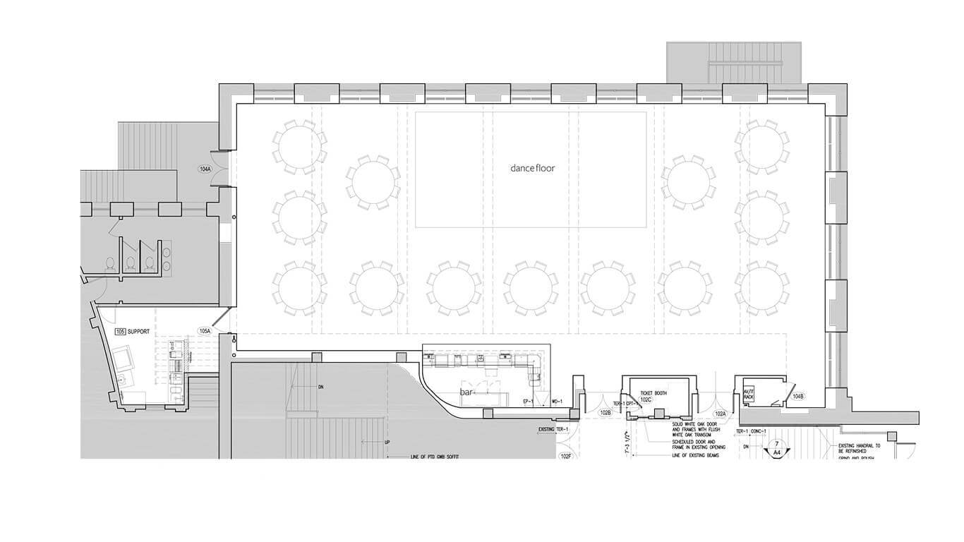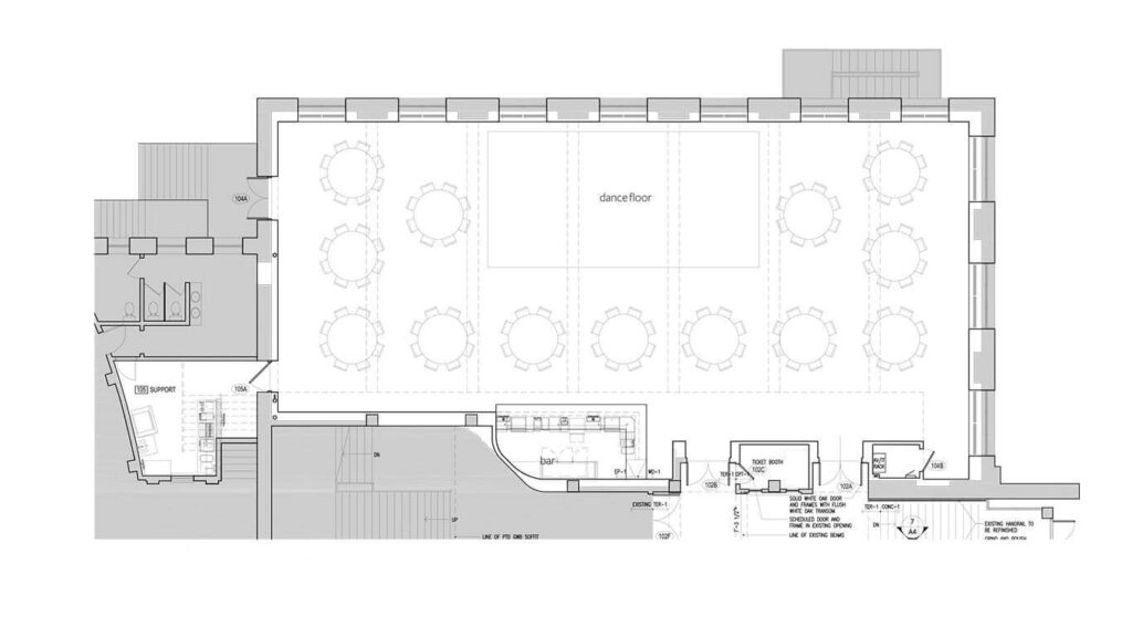 The Paradiso is a flexible space that can be made to feel intimate, spacious, or both. Measuring at 87′ wide and 35′ deep, it is sure to meet the needs of your crowd.